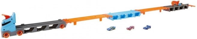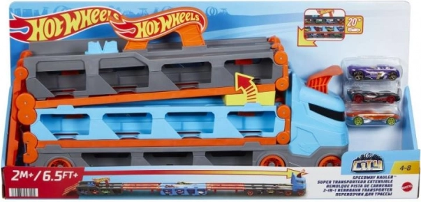 Med racerbæreren 2-i-1 fra Hot Wheels kan du nemt opbevare og udstille op til 20 biler takket være de små vinduer i traileren. Når det er tid til løb, forvandles bæreren ved udfoldning til en 1,8 meter lang racerbane. Køretøjerne forbliver synlige under banen, og lastbilens kabine bliver til en dobbelt start-rampe for to biler.