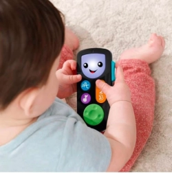 Den interaktive fjernbetjening fra Fisher-Price tilbyder sjov kombineret med læring til børn i alderen 6 til 36 måneder. Denne legetøjs-TV-fjernbetjening har mere end 20 melodier, lyde og sætninger, der lærer børn grundlæggende bogstaver, tal og farver.