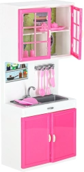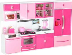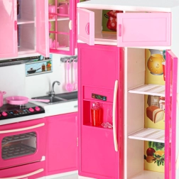Dette moderne dukke-køkken bringer børn ind i en fantasiverden og efterligning af hverdagsaktiviteter. Fire forbundne segmenter gør det muligt at samle et komplet køkken med alle vigtige elementer – fra komfur med ovn til køleskab og vask. LED-belyste blus og lyde giver madlege en realistisk fornemmelse.