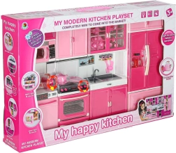 Sættet omfatter mikrobølgeovn og opvaskemaskine, komfur med ovn, vitrineskab med vask samt køleskab med skuffe. Børn kan lege hele scenariet med madlavning, bagning og oprydning.