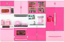 Pakken indeholder rigt tilbehør: gryder med låg, pande, brødrister med bevægelig løftestang, service, krus, bægre, “mælkekarton”, køkkenredskaber på kroge samt “isterninger”. Åbningsbare skabe, udtræksskuffe og hylder lærer børn orden, udvikler finmotorik og sociale færdigheder.
