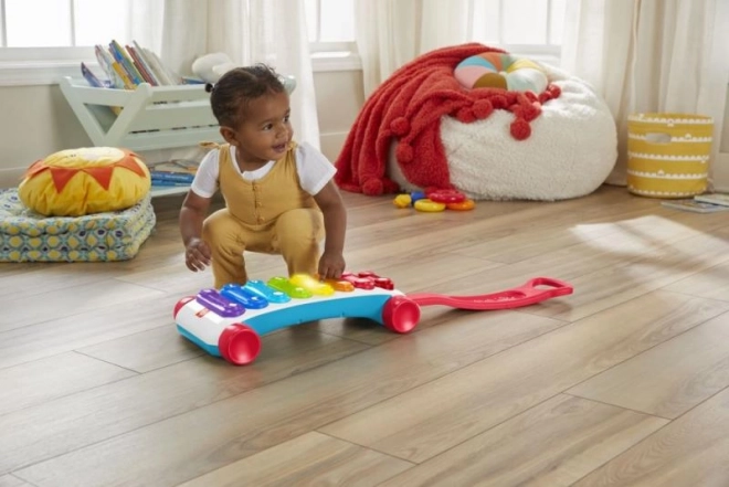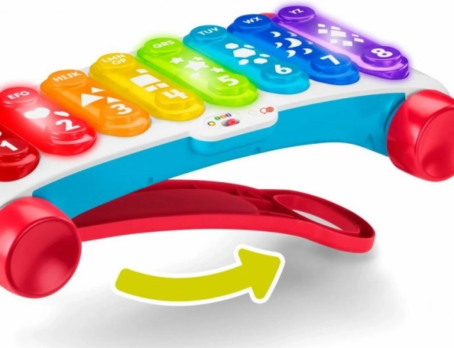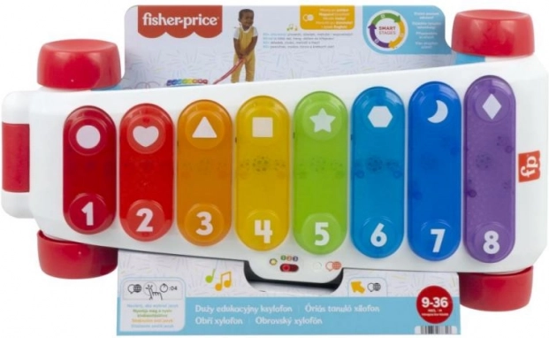 Den store læringsxylofon fra Fisher-Price er en ny version af det klassiske træklegetøj med endnu mere sjov! Denne ekstra store interaktive xylofon har 8 bagbelyste knapper, som aktiverer mere end 60 lydeffekter, inklusive forskellige lyde, sange og sætninger. Legetøjet har et robust sammenklappeligt håndtag, så de små musikere kan lege både siddende og på farten, når de trækker xylofonen. Learning Levels-teknologi gør det muligt at tilpasse legen, efterhånden som barnet vokser. Læringsudtryk og sange introducerer blandt andet alfabetet, tal og former samt enkle ord på engelsk. Tryk på globus-knappen for at vælge sprog: tjekkisk, polsk, ungarsk, slovakisk eller engelsk.