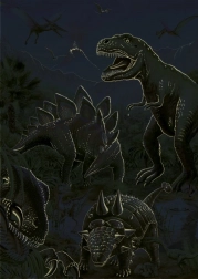 Opdag dinosaurernes verden gennem dette utrolige neonlysende puslespil! Dit barn vil nyde sjov samling med neonelementer, der lyser op i mørket og viser konturerne af dinosaurer sammen med et dramatisk bjerglandskab i baggrunden.