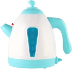 Kedlen er designet som en rigtig køkkenmaskine med elegant hvidt og turkis farveskema.