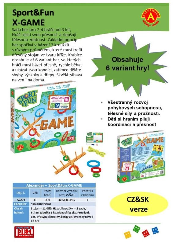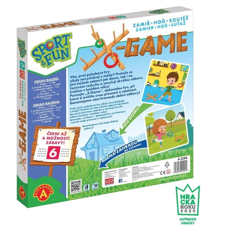 SPORT & FUN fra ALEXANDER blev kåret som Årets Legetøj 2020 i Tjekkiet i kategorien OUTDOOR. X-GAME er et dynamisk sæt, hvor du kaster 3 ringe i forskellige diametre på et krydsformet træstativ. Du scorer point efter ringens størrelse og hvor den lander. Spillet styrker koordination, balance og skaber sunde vaner gennem bevægelse.