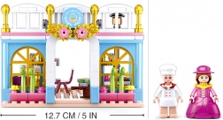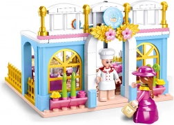 Byg et stilfuldt bageri/konditori med farverige detaljer, borde og et udstillingsvindue fyldt med lækkerier. To minifigurer – en dygtig konditor og en kunde – bringer hverdagsscener til live og styrker fantasi, finmotorik og evnen til samarbejde.