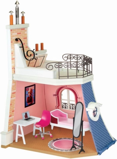 Dukkehuset har en terrasse på anden sal, dekoreret med lyserøde vægge og gelænder, som giver legen en ekstra dimension.