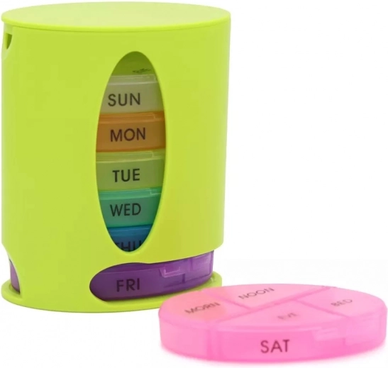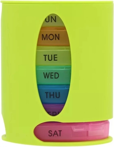 Denne ugentlige medicinorganizer hjælper med at holde regelmæssighed og orden i brugen af medicin eller kosttilskud. Hver dagsskuffe er farvekodet og forsynet med dagens navn, hvilket giver hurtig orientering og minimerer risikoen for at springe en dosis over.