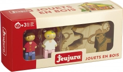 Udvid dit byggesæt med et JEUJURA-sæt med hestetema. Indeholder 2 bevægelige menneskefigurer og 3 dyrefigurer lavet af massiv bøg og fyr. Fremstillet i Frankrig og behandlet med sikre, vandbaserede farver og lakker.