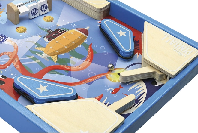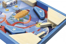 Træ-pinballen fra VILAC giver en tidløs oplevelse i solid kvalitet. Den farverige spilleflade med blæksprutte, ubåd og bumpere med point motiverer børn til præcist sigte og strategi. Du kan spille med det samme – i pakken er der 3 metal kugler og alt, hvad du skal bruge til et glidende spil.