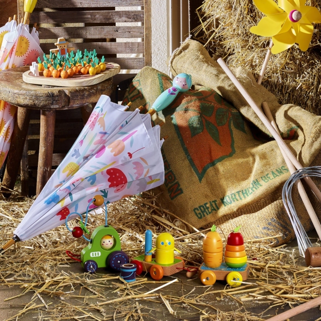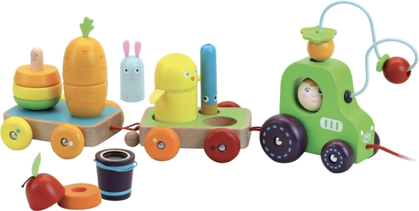 - Glideperler: Traktoren har perler på en tråd i form af frugt, der understøtter motoriske færdigheder.