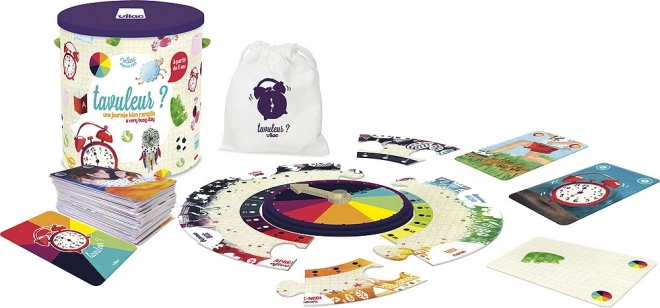 Vilac giver børn en udfordring i, hvordan de bedst kan fylde deres dag. Dette spil lærer ikke kun at aflæse tiden på en klassisk urskive, men udvikler også andre kognitive evner på en passende måde. Under legen kan børn lære at genkende former og farver og samtidig øve koncentration, når de samler den runde urskive af skiver.