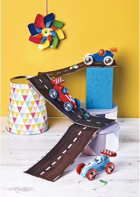 Sødt træk-racerbil i lakeret træ i turkis med rødt vingespoiler glæder små racerkørere fra 18 måneder. Understøtter balance og bevægelseskoordination, er fremstillet i Frankrig, og takket være de kompakte mål 16 × 9 × 9 cm kan børn nemt tage den med på hvert eventyr.