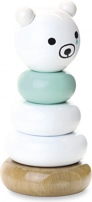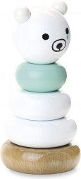 Dette elegante stabeltårn med bjørn i hvid–mint kombination og naturligt trælook er et ideelt første pædagogisk legetøj. Børn øver korrekt rækkefølge af ringe, størrelsesforskel og bevægelsesrytme, mens de blide farver og det søde bjørneudtryk vækker nysgerrighed og indbyder til rolig leg.