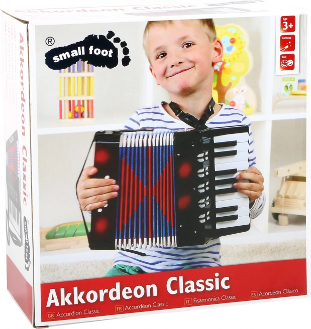 Small foot Classic børnetharmonika bringer glæden ved at udforske lyde og rytmer ind på børneværelset. Det lette plastkabinet, de kompakte mål og de behagelige stropper gør det muligt for børn at spille stående eller siddende uden unødig belastning af hænderne. De farvede bælge og den blanke finish fanger øjet med det samme.