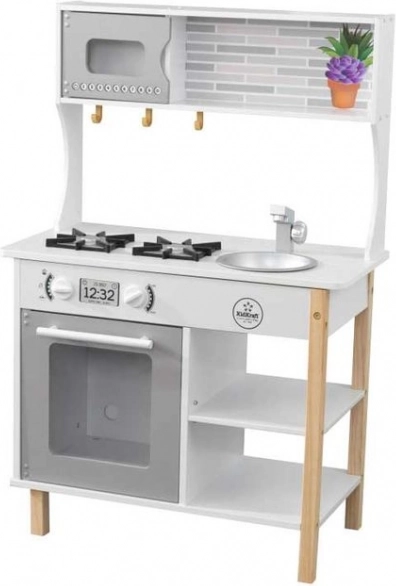 Det stilfulde træ-køkken fra KidKraft forvandler børneværelset til en lille bistro. Det byder på realistiske drejeknapper med klik, åbningsbare ovn- og mikrobølgedøre og 38 stk. tilbehør. Takket være den aftagelige vask for nem rengøring, hylder og kroge har alt sin plads. Velegnet fra 3 år. Mål 59,9 × 34,29 × 90 cm.