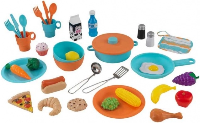 Pakken indeholder 38 stykker service, madvarer og køkkenredskaber. Børn kan straks servere, røre, skære og opdage nye opskrifter.