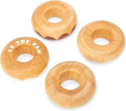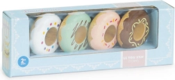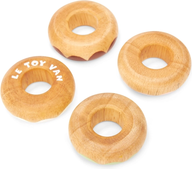 Dette sæt træ-donuts fra Le Toy Van er ikke kun æstetisk tiltalende, men frem for alt sikkert og lavet af massivt træ. Hver donut er blidt afrundet for sikker leg og dekoreret i pastelfarver med forskellige drys-mønstre. De vandbaserede farver, der bruges ved den manuelle eftermaling, er ikke‑giftige og helt sikre for børn.