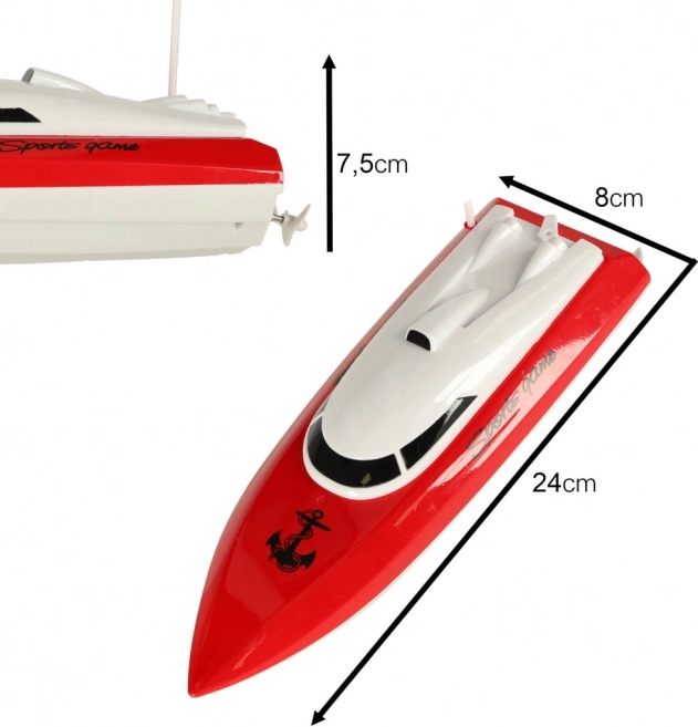I pakken findes alt, hvad du behøver for at komme i gang: båd, fjernbetjening, netoplader, akkumulator og antenne. Fjernbetjeningen ligger godt i hånden og kræver 2× AA 1,5 V batterier (medfølger ikke). De kompakte mål 24 × 8 × 7,5 cm gør den nem at transportere og opbevare.
