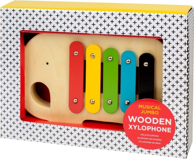 Fem klart farvede metalplader på en træramme formet som en elefant indbyder til at udforske toner og tage de første musikalske skridt. Inkluderer en trækølle med elastisk fastgørelse.