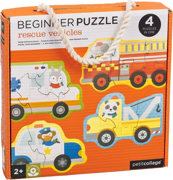Sød sæt med fire puslespil med redningskøretøjer vil glæde små byggere fra 2 år. Hvert mini-puslespil har en forskellig sværhedsgrad (3–6 brikker), så børnene kan gå frem trin for trin. Fremstillet af genanvendt pap og trykt med plantebaserede trykfarver. Inkluderer en praktisk opbevaringsboks for nem transport og opbevaring.