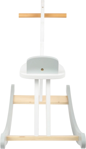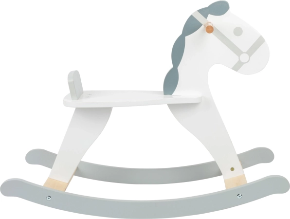 Klassisk gyngenhest i moderne skandinavisk stil, der kombinerer hvid og grå, med komfortabelt sæde med ryglæn og solid trækonstruktion. Ideel til børn fra 2 år, understøtter balanceudvikling, koordinering og giver langvarig sjov på ethvert børneværelse.