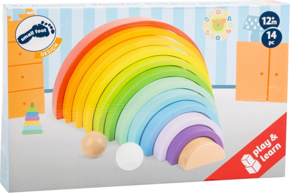 De 14 farvede buer kan samles til regnbuer, broer, tunneler og tårne. Børn øver balance og fantasi ved hver ny kombination.
