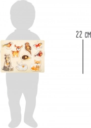 Puslespillet byder på søde motiver som rådyr, hare, pindsvin og andre skovvenner, der støtter visuel perception og læring af dyrenes navne. Den høje kvalitet i træ sikrer lang levetid og sikker brug.