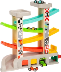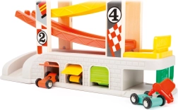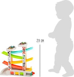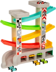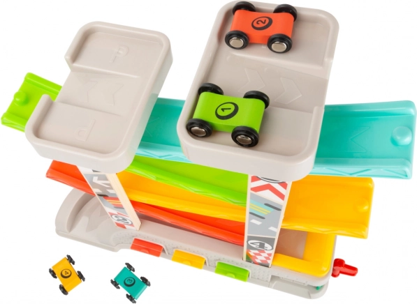 Racerbanen indeholder forskellige niveauer og farverige biler, som sikrer sjov og lærende leg.