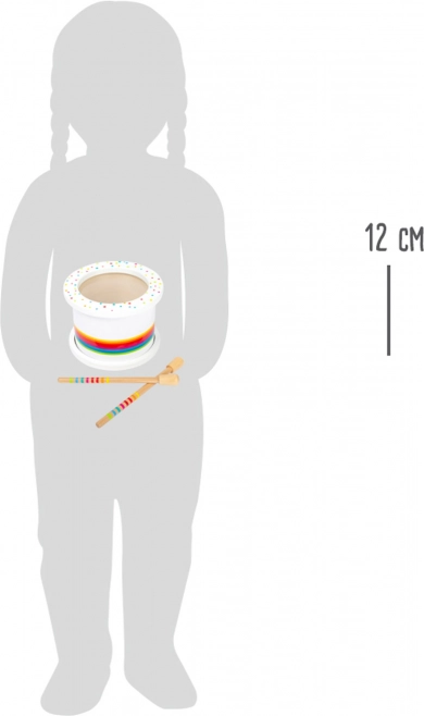 Trætrommen har en hvid overflade med regnbuestriber og farvede prikker.
