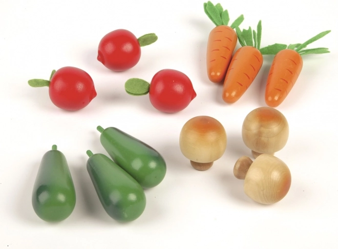 Sættet indeholder et udvalg af populære grøntsager – gulerod, squash, tomat og svampe – placeret i en robust trækasse. Alt er omhyggeligt fremstillet af materialer i høj kvalitet fra ansvarlige kilder, sikre til børns leg.