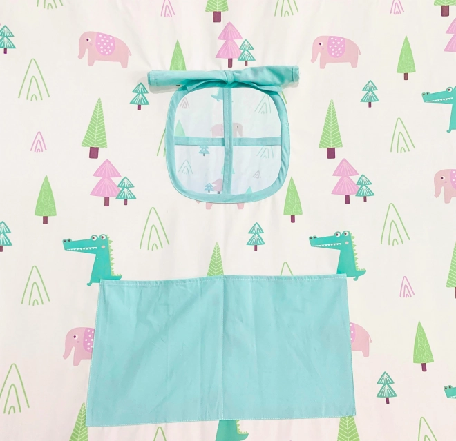 Teltet har et gennemsigtigt vindue og en lomme, som gør det nemt at organisere legetøj. Motivet med lyserøde elefanter, turkise krokodiller og træer øger tiltrækningskraften.