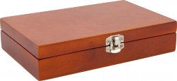 Den robuste trææske med metal-lås beskytter både kort og terninger. Passer nemt i rygsæk eller kuffert.