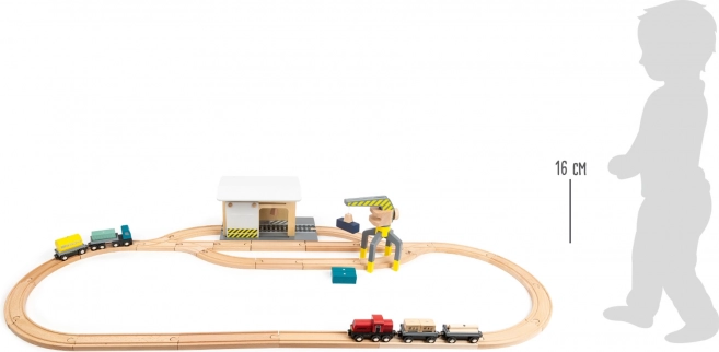 Opdag et komplet træsæt til den lille jernbane, fuldt kompatibelt med almindelige togbanesystemer. Børn vil elske realistisk lastning med kranen, transport af gods og leg i depotet. Sættet rummer op til 44 dele, herunder 25 skinner, en 360° roterende kran, magnetiske vogne og laster samt en skydedør med talje. Fremstillet af 100% FSC-træ for sikker og bæredygtig leg.