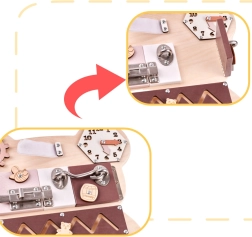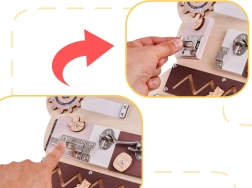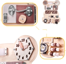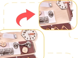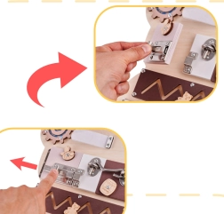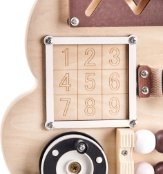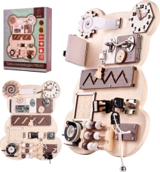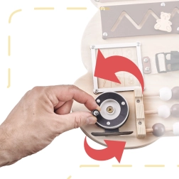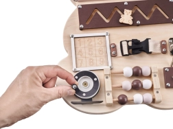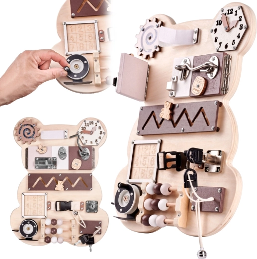 For at sansebrættet skal fange barnets opmærksomhed og opmuntre til leg, har tavlen form som en sød bamse og de anvendte farver er behagelige og glæder øjet! På brættet er der mange elementer fra de enkleste aktiviteter, som eksempelvis at flytte kugler på en abacus, til de mere komplicerede, som at åbne en lås med en nøgle!