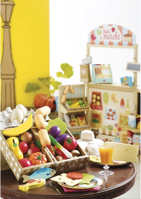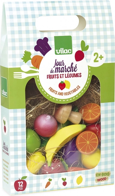 Dette kvalitets-sæt fra VILAC giver børn et farverigt udvalg af populære frugter og grøntsager. Trækonstruktionen med filttilbehør er holdbar, sikker og behagelig at røre ved. Sættet er perfekt til leg i legekøkkenet og på markedet, og det understøtter kommunikation, kreativitet og læring om sund kost.