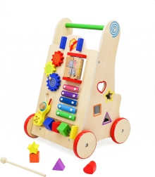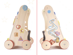 Alle dele af skubbewognen er nøje slebet for at beskytte små hænder mod splinter og malet med ugiftige, miljøvenlige farver. Konstruktionen er stabil, med træhjul belagt med gummi for ekstra sikkerhed. På siderne har skubbewognen også en formsorterer med fire farvede klodser og en labyrint med søde dyr.