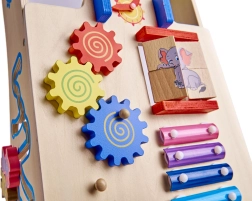 På forsiden findes en plade, der er fuld af interaktive elementer til at stimulere barnets sanser, herunder ur, tandhjul og klokkespil.