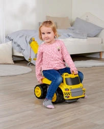 To praktiske håndtag på kabinen sørger for nem styring, mens for- og bagbeskyttelse mod at vælte øger sikkerheden under kørslen. Metalakser og bløde dæk, der ikke laver striber, sikrer jævn kørsel på indendørs gulve såvel som udendørs på legepladsen eller i haven.