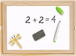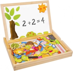 Giv dine børn timers sjov og kreativ læring med denne træ-magnetiske tavle! Tavlen tilbyder to sider: sort til tegning med kridt og hvid til skrift med tusch eller arrangering af magnetiske billeder. Med et hæfte med eksempler kan børn skabe forskellige mønstre og motiver.