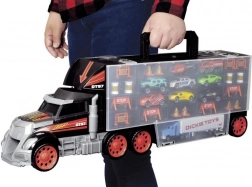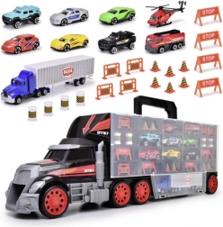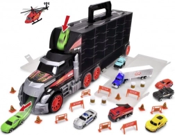 Den enorme lastbil-kuffert kombinerer opbevaringsboks og legesæt i ét. De åbnebare rum rummer hele sættet af køretøjer og tilbehør, og det praktiske håndtag gør transporten nem. Den manuelle launch-mekanisme i kabinen forvandler lastbilen til en racerbane og sørger for actionfyldte starter.