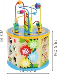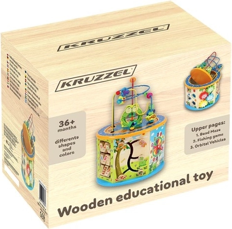 Denne interaktive træ-kube forener læring og leg i ét. Barnet øver at tælle, at skelne farver og former, tidsforståelse med uret samt hånd–øje-koordination via kuglelabrint og bevægelige dele. De glade illustrationer og den robuste trækvalitet fremmer kreativitet og sikker leg.