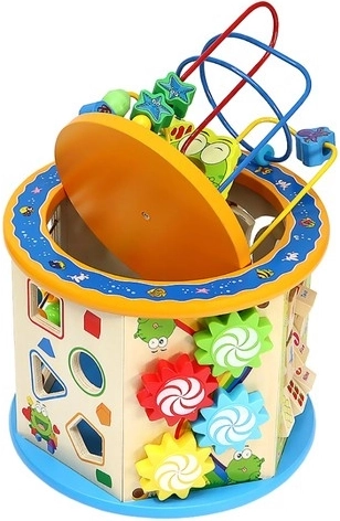 Kuglelabrint, formesorter, tandhjul, kugleramme, tal, ur, labyrint og spillepanel – alt i én stabil kube.