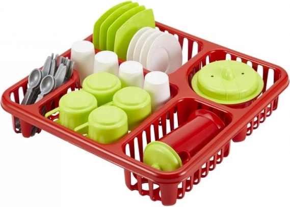Dette store servicesæt med opvaskestativ er ideelt til de første køkkenlege. Sættet rummer et farverigt udvalg af tilbehør – fra kopper og tallerkener til gryde og kande med låg. Det robuste opvaskestativ med målene 29,5 × 10 × 29,2 cm holder alting overskueligt på plads og støtter gode vaner omkring orden.