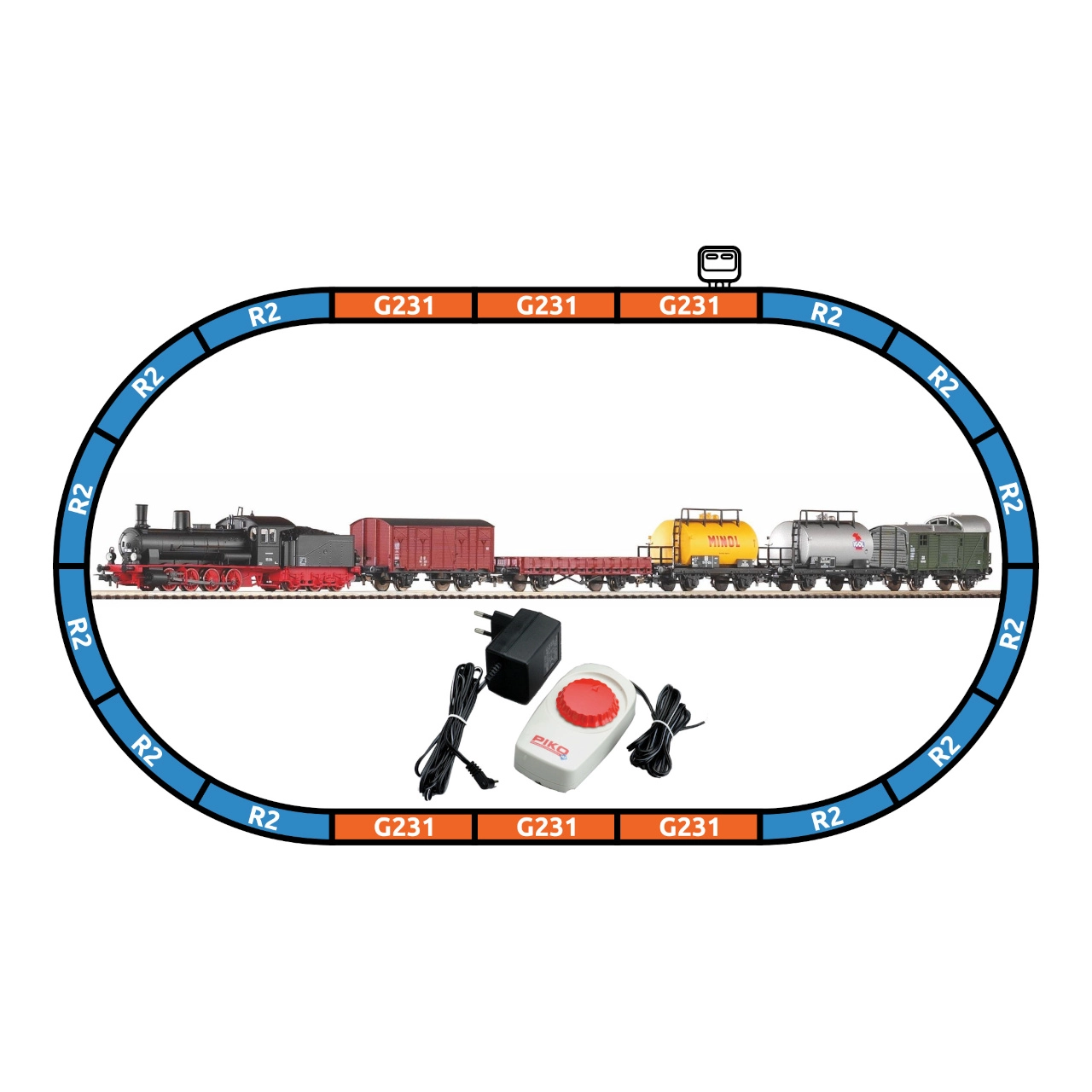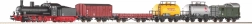 Damplokomotiv BR 55 med tender, 5× godsvogn, 12× bue R2 med ballast (55412), 5× lige G231 med ballast (55401), 1× lige G231 med strømtilslutning (55406), underlag til klemme (55447), strømklemme (55270), grundlæggende analog controller med strømforsyning (55003)
