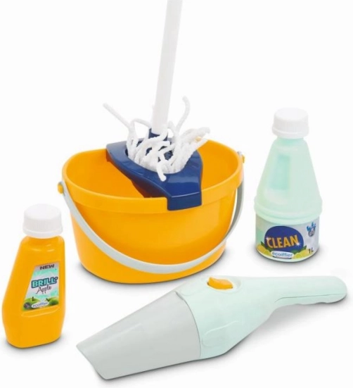 Vognen indeholder alle nødvendige værktøjer til leg med rengøring, inklusive kost, moppe og håndstøvsuger.