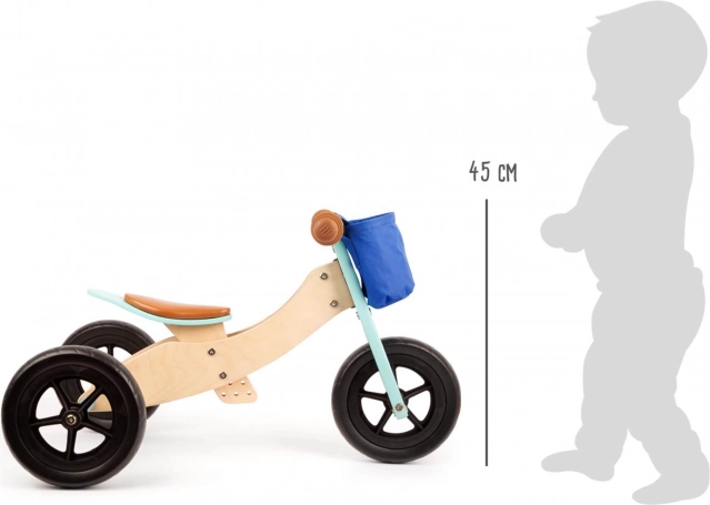 Stilfuld og sikker træ balancecykel til børn, der vokser med dem. Tilbyder muligheden for at omdanne fra en trehjulet til en tohjulet version, understøtter udviklingen af motoriske færdigheder og koordination.