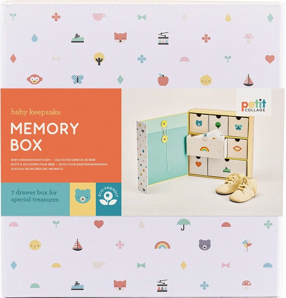 Den elegante og gennemtænkte minderboks hjælper dig med at organisere alle de mest værdifulde øjeblikke fra barnets første måneder og år. Med flere skuffer og en lomme sorterer du nemt småting og kan altid vende tilbage til dem med glæde. Det minimalistiske og legende design med illustrationer gør boksen til en smuk detalje på børneværelset.