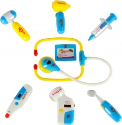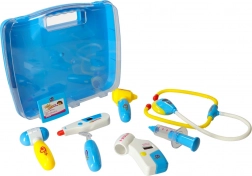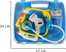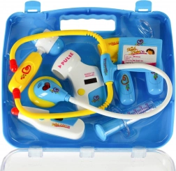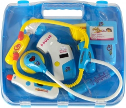 Sættet indeholder lægeredskaber som stetoskop, termometer, blodtryksmåler, øreværktøj, sprøjte, hammer, lægemærkat og værktøj til halskontrol med lys.