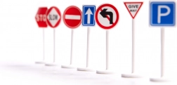 1 x fly, 3 x lille bil, 1 x sæt vejskilte